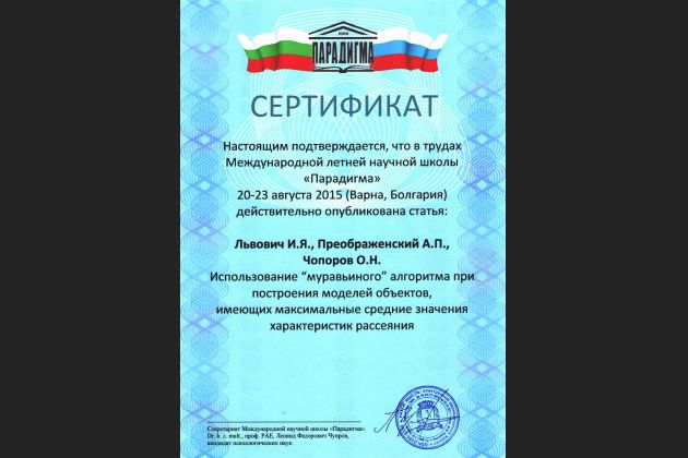С 20 по 23 августа 2015 г. д.т.н., профессор ВИВТ Львович И.Я. принял участие в работе Международной летней научной школы "Парадигма" в г. Варна, Болгария. В трудах научной школы "Парадигма" опубликована статья Львовича И.Я., Преображенского А. П., и Чопорова О.Н. "Использование "маравьиного" алгоритма при построении моделей объектов, имеющих максимальные средние значения характеристик рассеяния".