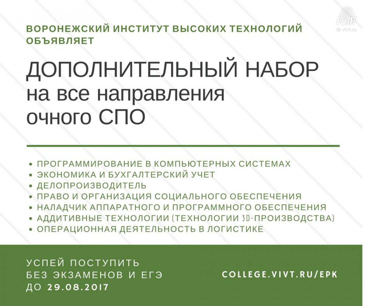 ВИВТ объявляет дополнительный набор на все направления среднего профессионального образования очной формы обучения!