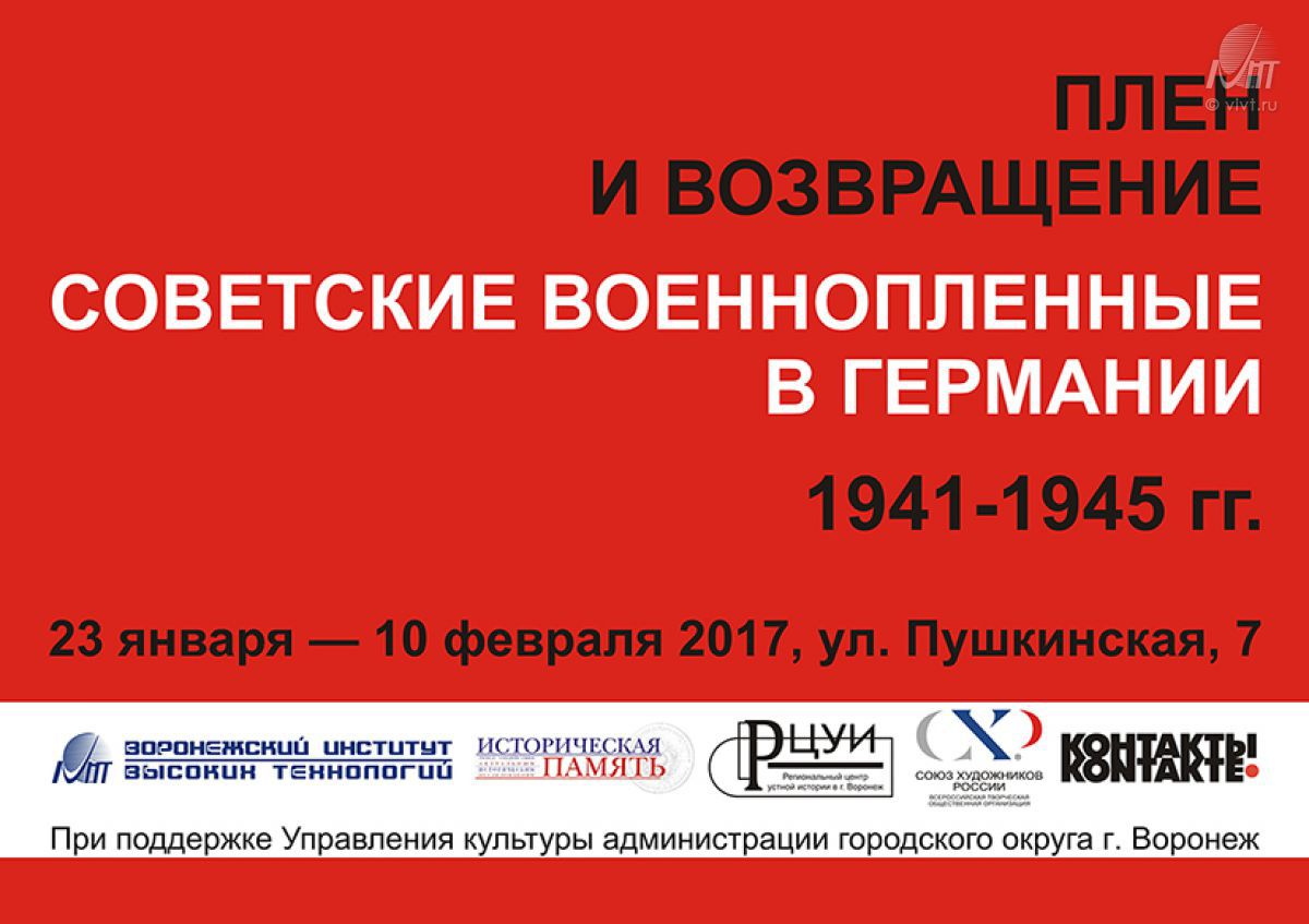 23 января 2017 г. в выставочном зале Воронежского отделения Союза художников России на ул. Пушкинская, 7 состоялось торжественное открытие выставки «Плен и возвращение. Советские военнопленные в Германии 1941-1945 гг.», которую в преддверии празднования Дня освобождения г. Воронеж от немецко-фашистских захватчиков организовали Региональный центр устной истории и служба международных отношений ВИВТ.
