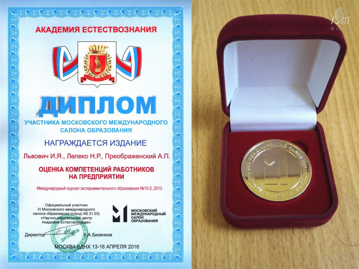 Cтатья «Оценка компетенций работников на предприятии» (опубликованная в журнале «Международный журнал экспериментального образования», авторы И.Я. Львович, Н.Р. Лелеко, А.П. Преображенский) была отобрана для представления и обсуждения на Московском международном салоне образования 2016, проходившим на ВДНХ 13-16 апреля 2016 г.