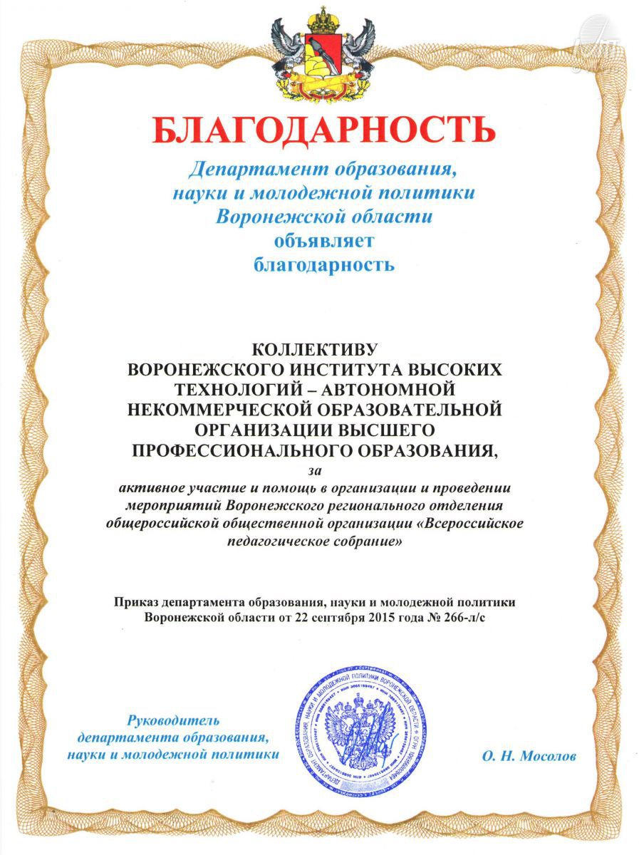 Департамент образования, науки и молодежной политики Воронежской области объявил благодарность коллективу Воронежского института высоких технологий.